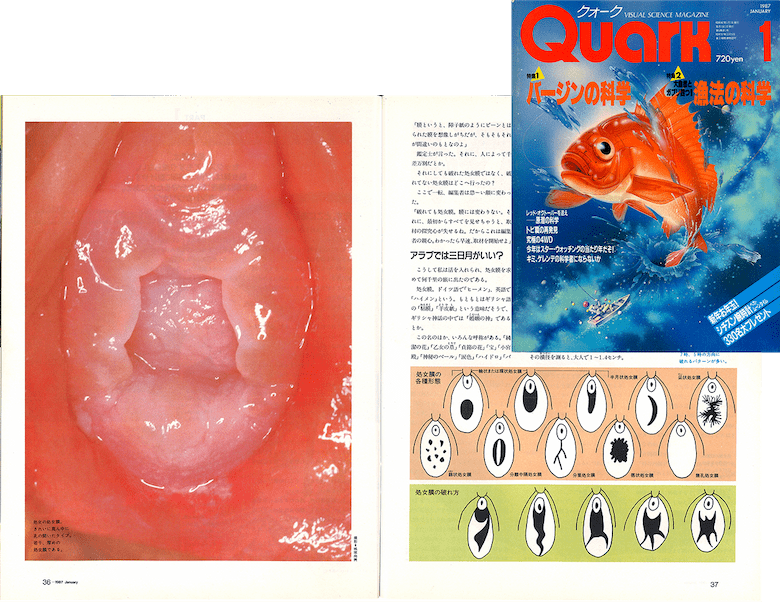 すごかったのが、87年1月号「バージンの科学」だ。前出の特集でも当然、女性のヌードが多数登場するし、「かさい博士の女性器の科学」ではリアルな女性器の模型も掲載されていた。しかし、それはあくまでも模型だったが、「バージンの科学」では、いわゆる処女膜(膣口)の写真がページいっぱいにドーンと掲載されているのである。