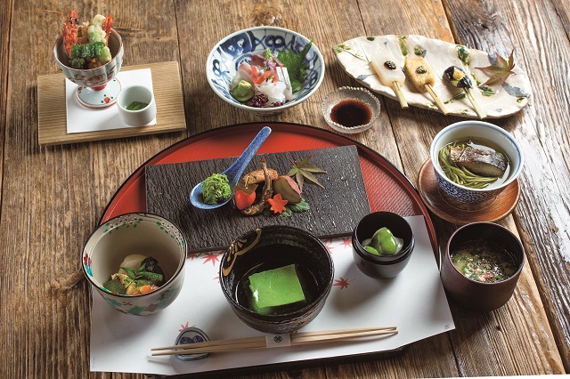 宇治川を挟んで通圓茶屋の対岸にある料亭『辰巳屋』では、生の大豆からつくった抹茶豆腐をはじめ、一つのコースで七服分もの抹茶を使った、茶どころにふさわしい抹茶料理を、七代目当主と若主人が丹精こめて料理し、提供する。