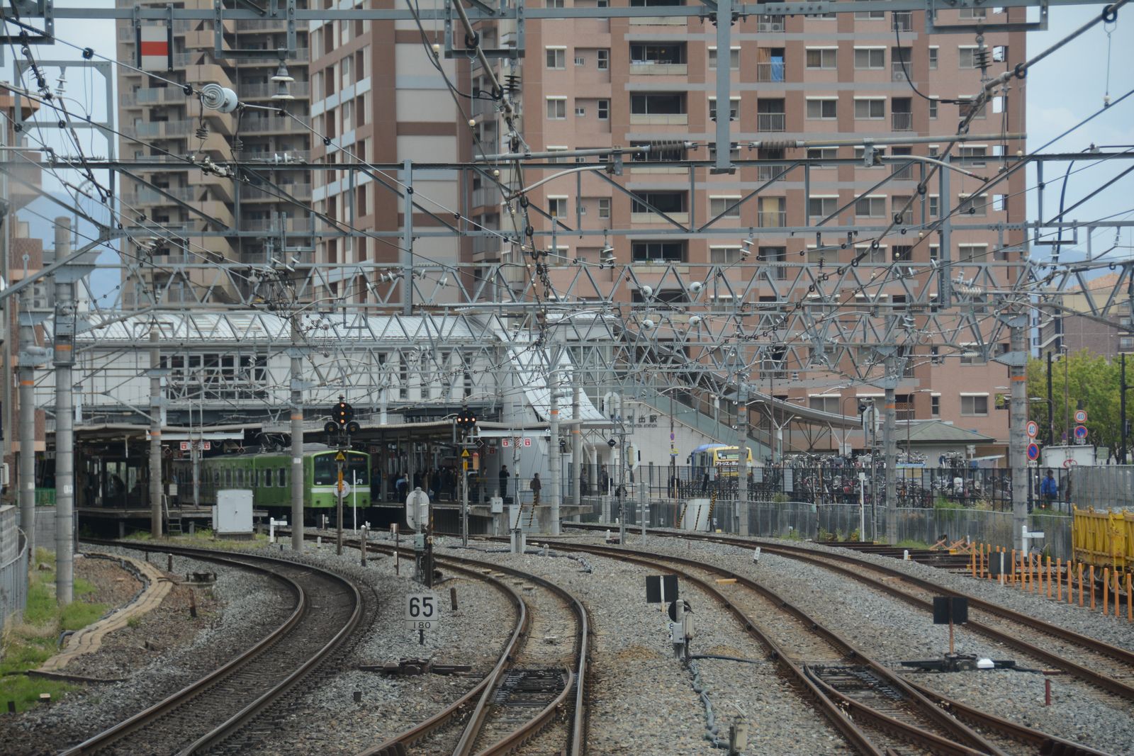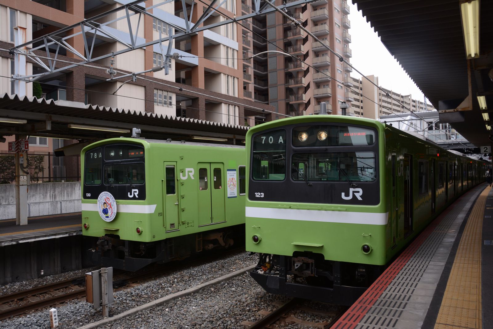 電車は201系という通勤電車。国鉄時代の1979年に「省エネ電車」として首都圏の中央線に登場したものと同形式だ。中央線の車両は、とうに引退してしまったが、関西圏では、まだ活躍している。オレンジ色や青い色のものに馴染んでいたので、古い車両であっても黄緑色は新鮮な感じがする。