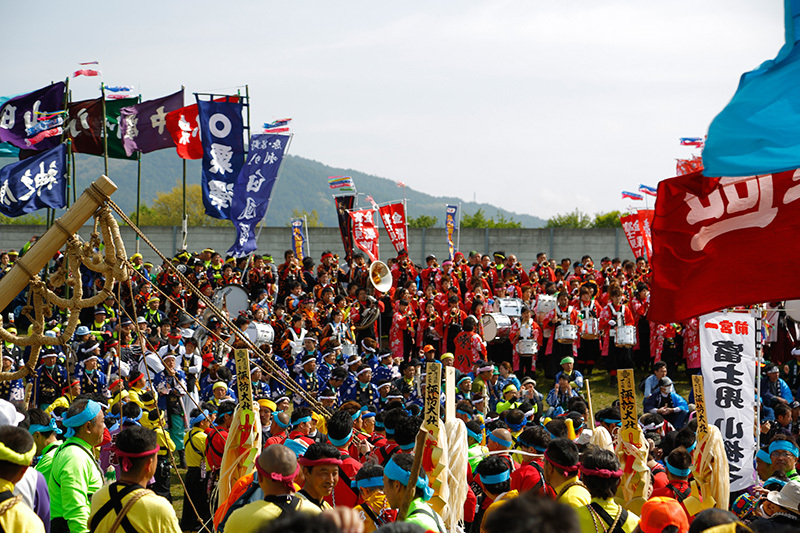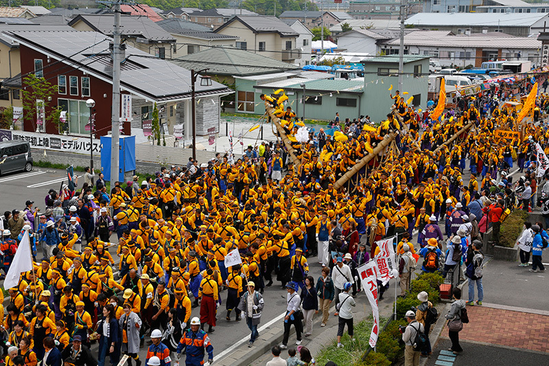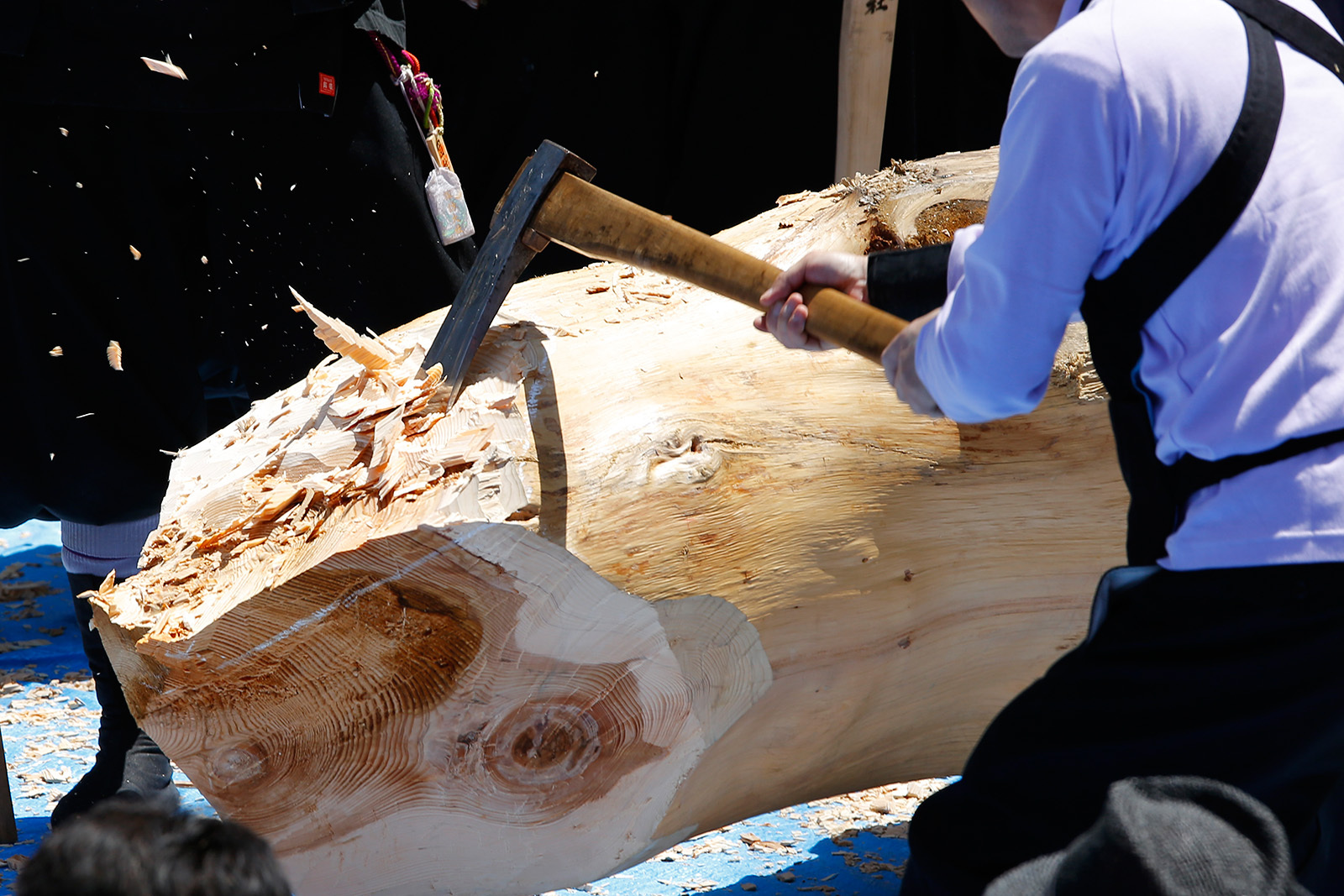 5月5日、本宮に曳かれた御柱は御柱の先端を三角錐に整える「冠落し」の儀が行われる。コツコツと斧(ヨキ)で削られていく。削られた木片は氏子の間で大切に配られる。