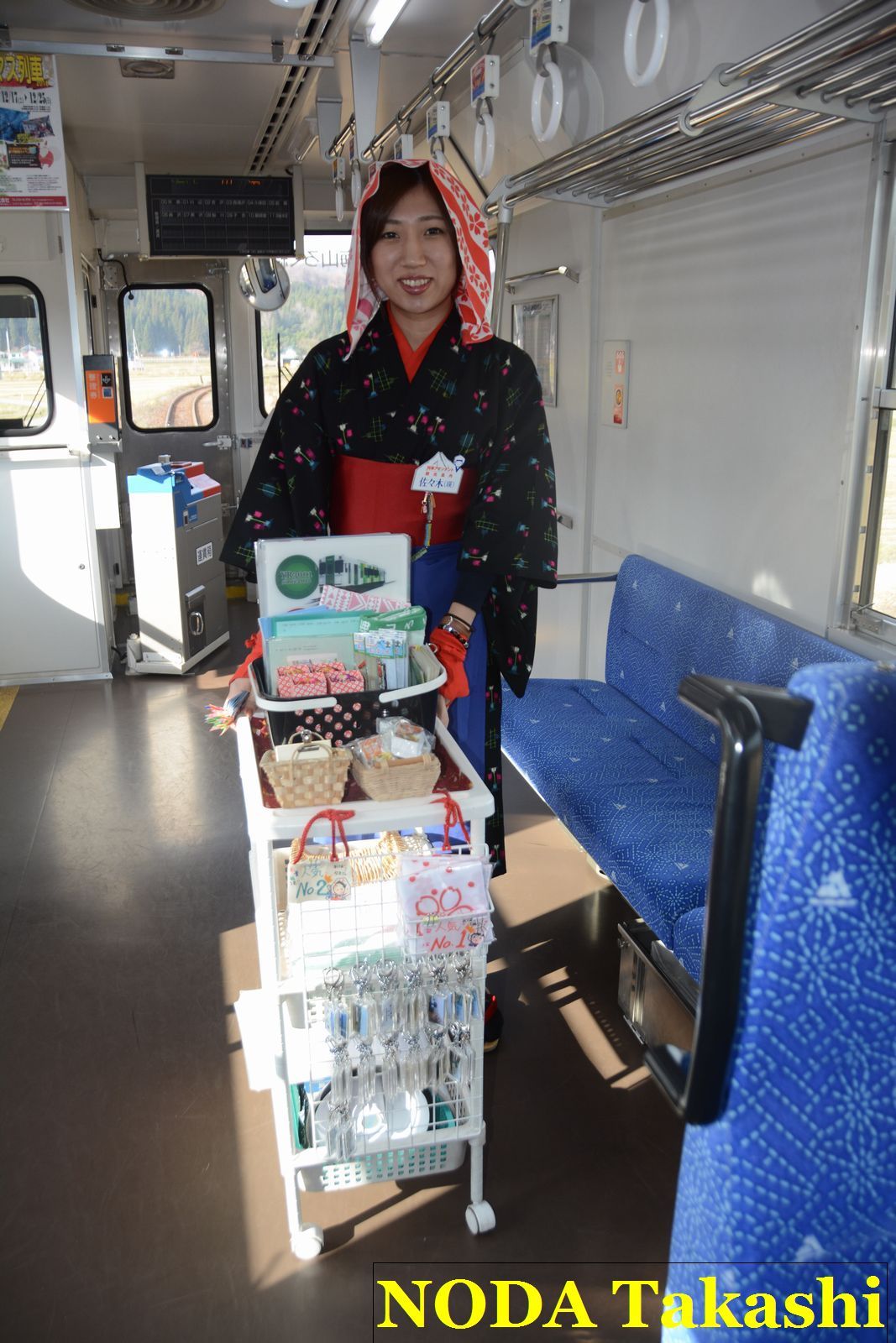 各駅停車の普通の列車だが、「まごころ列車」という愛称が付き、秋田おばこのイラスト入りのヘッドマークも掲げている。1日1往復のイベント的な列車で、秋田おばこ姿の女性アテンダントが乗り降りの案内はもちろんのこと、車窓案内、列車や鉄道の説明、そして車内販売など真心をこめてサービスしてくれるのだ。