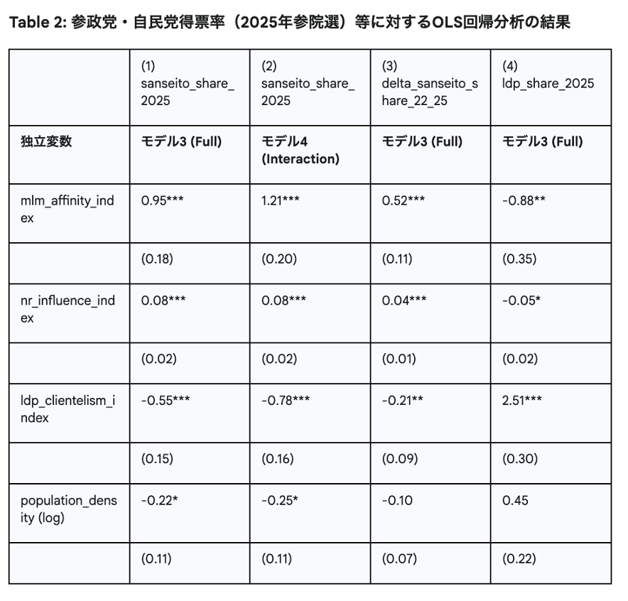 同じ変数が、自民党得票率には有意なマイナス。つまりこれは自民党→参政党の票移動を裏付ける数値的“物証”だ。