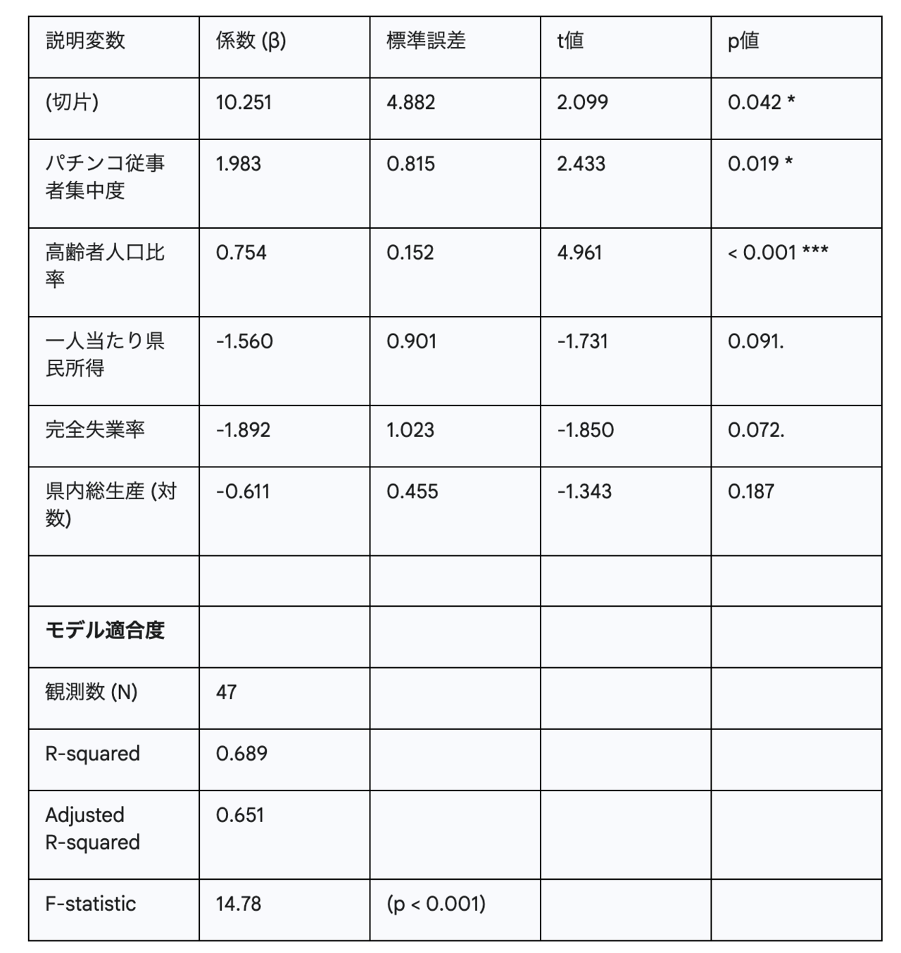 モデル全体の適合度を見ると、決定係数(R-squared)は0.689、自由度調整済み決定係数(Adjusted R-squared)は0.651であった。これは、このモデルが都道府県間の自民党得票率のばらつきの約65%を説明できていることを意味し、非常に高い説明力を持つことを示している。また、F検定の結果も統計的に極めて有意(p < 0.001)であり、モデル全体が統計的に意味を持つことが確認された。