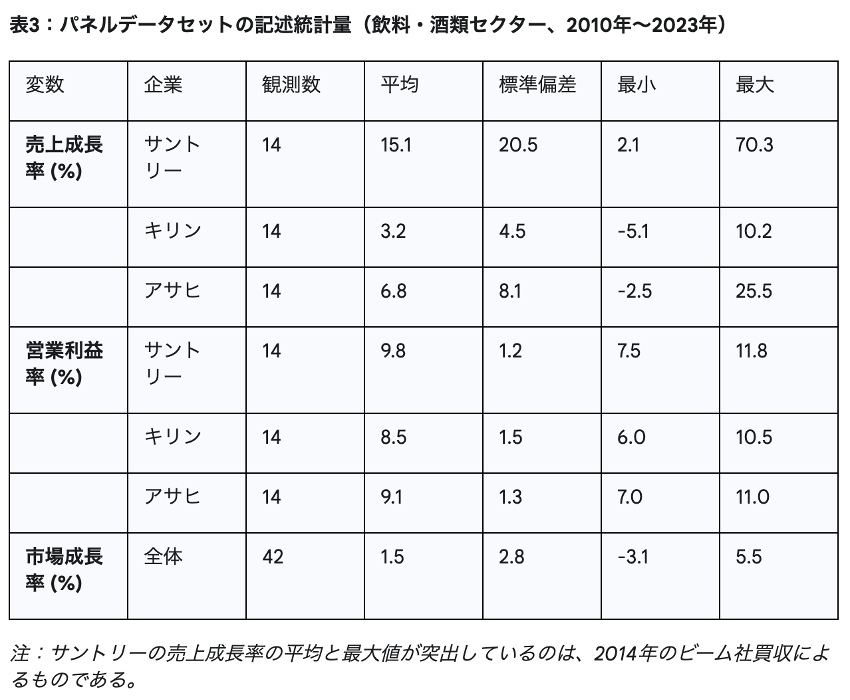 本稿が用いた回帰モデルは、2010年から2023年までのサントリー、キリン、アサヒのデータを追跡し、「買収そのもの」と「新浪効果」を切り分けて分析するものだ。