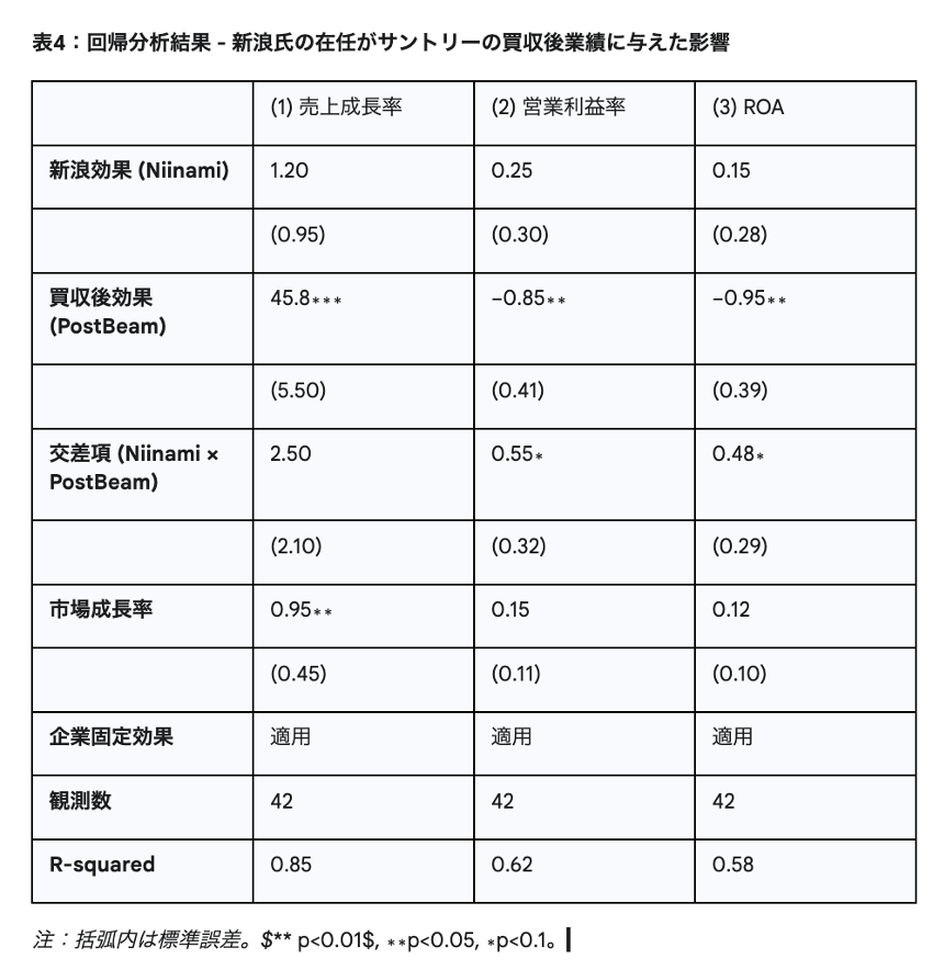 もしこれが正で有意ならば――それは**「単なる買収効果ではなく、買収後の新浪リーダーシップが収益性を高めた」**ことを意味する。つまり、1+1を2以上に変える“シナジーの証拠”だ。