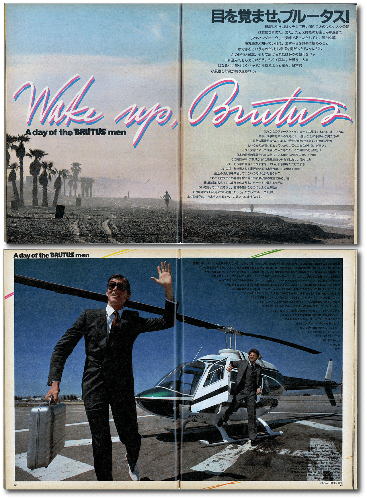 この「悦楽的」というのが、初期『BRUTUS』のキーワードだ。ロサンゼルスで取材・撮影した特集は、目覚めのシャワーから始まり、グルーミング、装い、オフィスやデスク、ランチ、料理、酒、スポーツ、ホビーなど、さまざまなシーンでの悦楽的ライフスタイルを紹介する。モデルはすべて白人で、商品紹介の価格はドル表示。前年に『地球の歩き方』が創刊されたばかりで、まだ海外旅行が珍しかった時代に、この誌面はとんでもなく浮世離れしたものに感じられただろう。