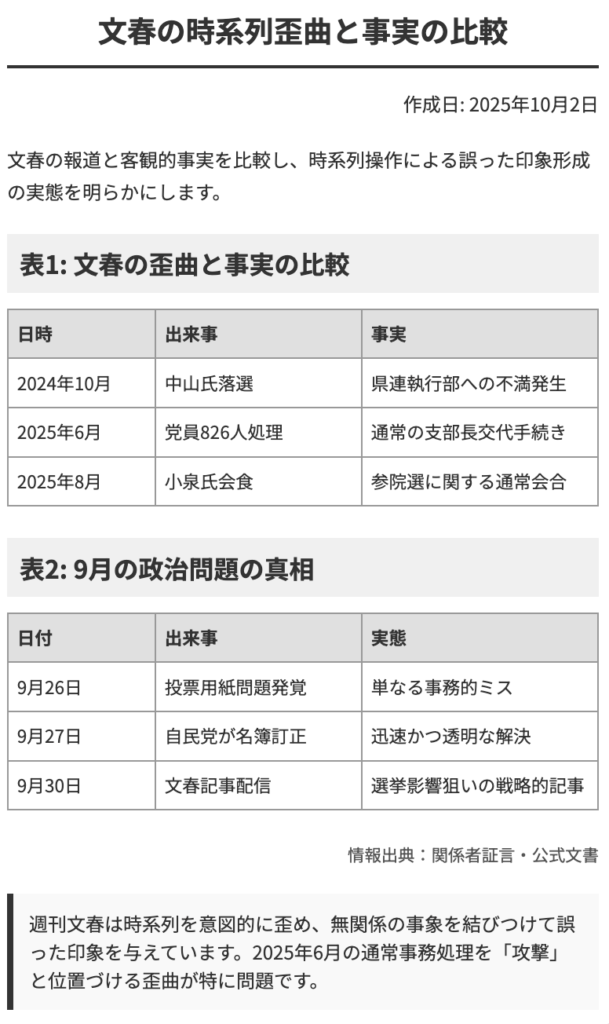 以上の検証から、提供された論考は、週刊文春の「党員抹消」報道が、「時間軸の歪曲」「偏った情報源の無批判な利用」「不都合な真実の隠蔽」という複数の欺瞞的な手法を組み合わせることで捏造された、計画的なプロパガンダであったと結論付けている。真のスキャンダルは疑惑そのものではなく、メディアが民主主義の根幹である選挙プロセスに不当な影響を与えようとした、その報道姿勢そのものであると告発しているのである。