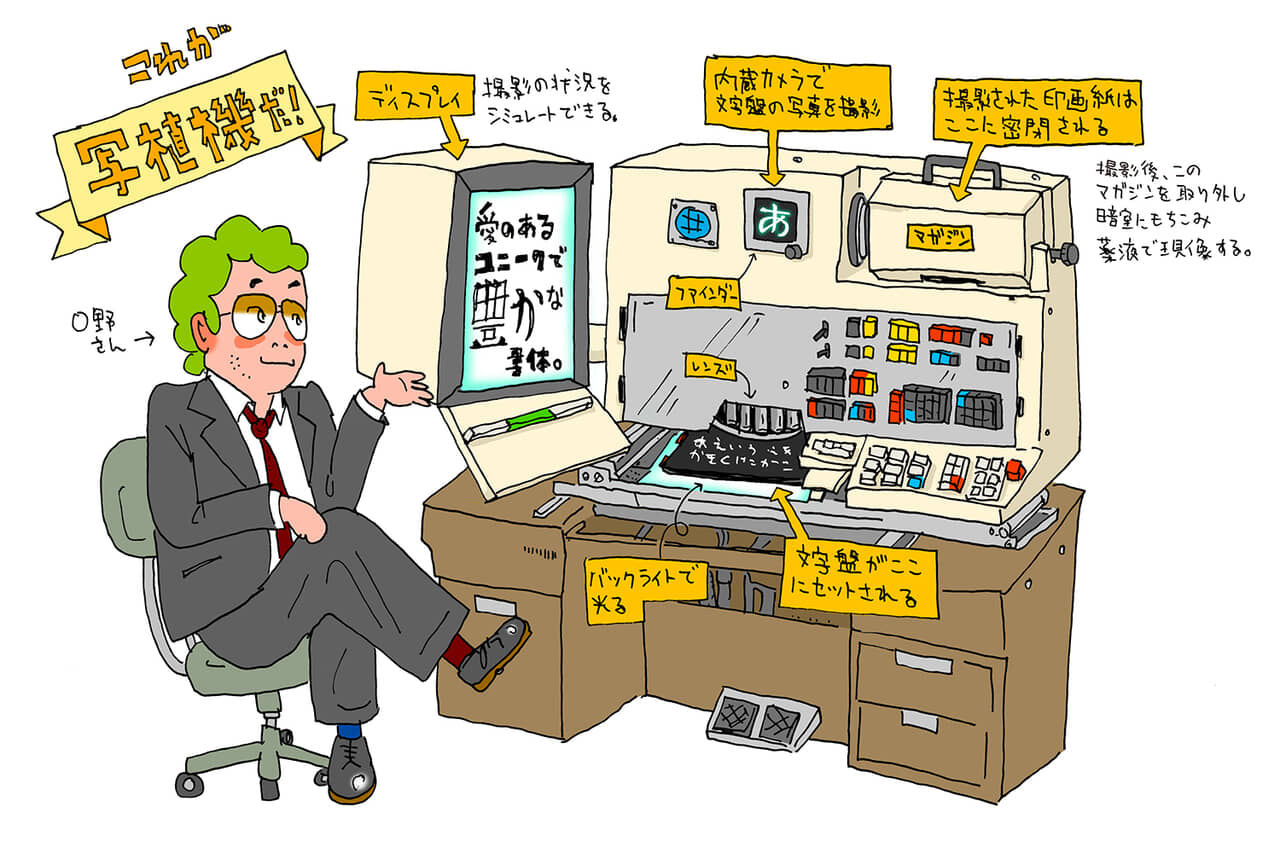 写植とは、写真植字機という機械を用いて、文字盤の文字をひとつひとつひとつカメラで撮影、撮りならべた文字組を印画紙に感光させ、その印画紙を紙焼き(今で言うプリント)として現像する技術。超ざっくり言うと、写真の原理を応用した文字デザイン製作システムのこと。