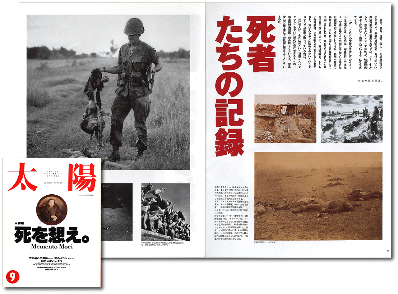 なかでも印象に残っているのは、1992年9月号「死を想え。」だ。まず特集冒頭の「死のイコン」(構成・文:飯沢耕太郎)に圧倒される。〈現実の死が隠蔽されてしまった現代、写真によるイメージの死者たちがそのタブーを切り裂いていく〉とのリードから始まる誌面には、誤診により2歳5カ月で亡くなった娘を撮った太田順一、棺に納められた最愛の妻・陽子を撮った荒木経惟のように身近な者の死を記録した写真、戦争や犯罪による死者の写真、写真家が死者を演じたセルフポートレート、世界各地の死の儀式を捉えた写真などが並ぶ。もとより有名な写真だが、石川文洋による「解放戦線兵士の死体を持ち上げる米軍兵士」の衝撃は、今なお薄れることはない。