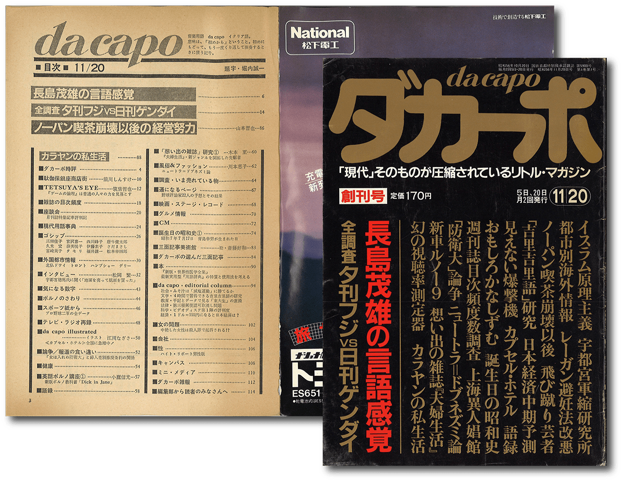 『ダカーポ』の創刊は、1981年11月20日号。A5判、月2回刊で「『現代』そのものが圧縮されているリトル・マガジン」とのキャッチコピーを掲げる。100ページほどのボリュームだが、170円という値段は当時としてもお手頃価格と言えよう。