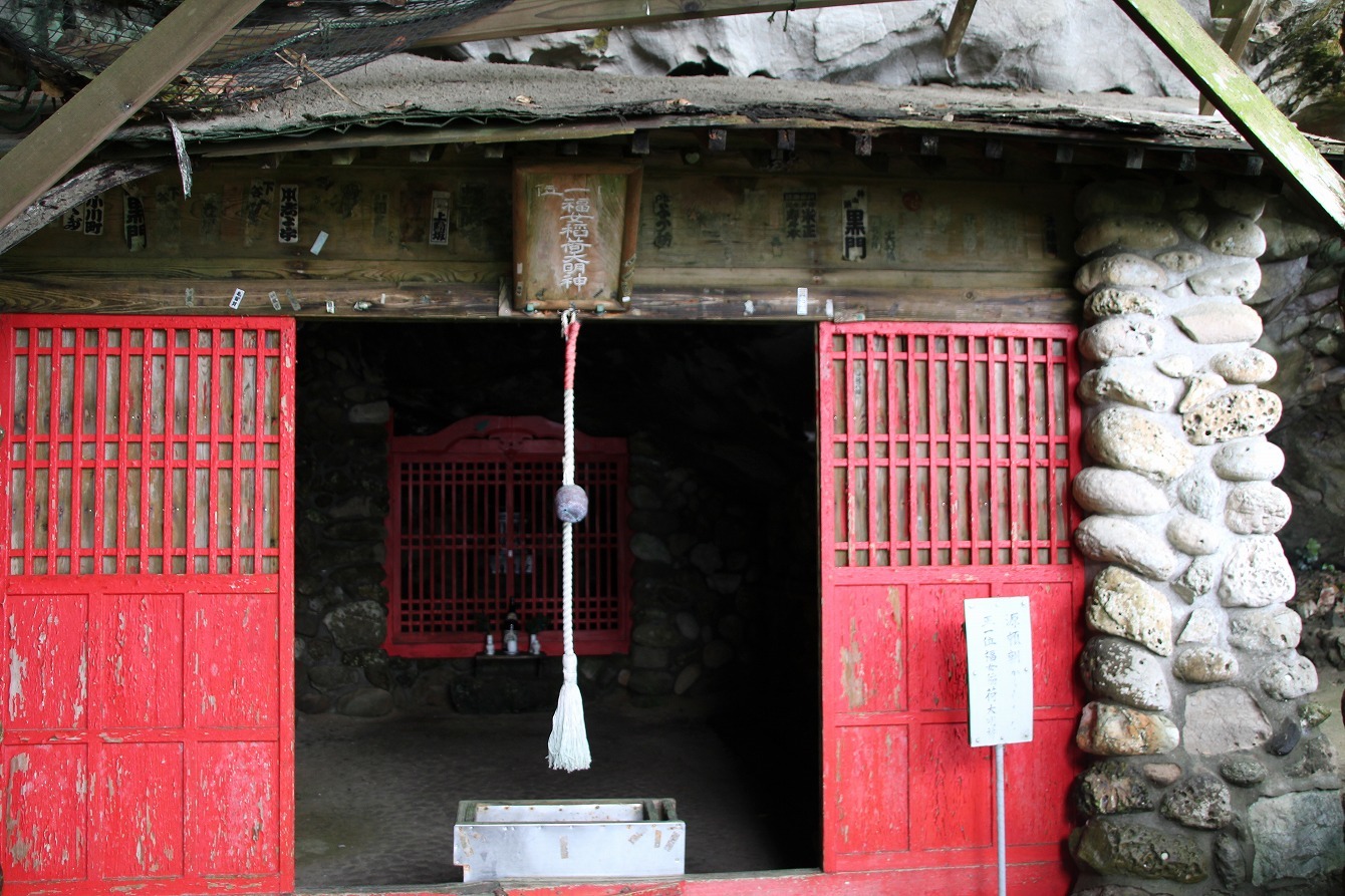 ▲頼朝が身を潜めたと伝えられる洞窟(稲荷大明神)