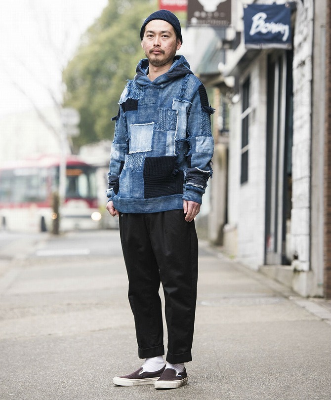 トレンドの先端を行くショップスタッフの中には、ワイドなデニムのアメカジ感を活かした骨太コーデも散見。