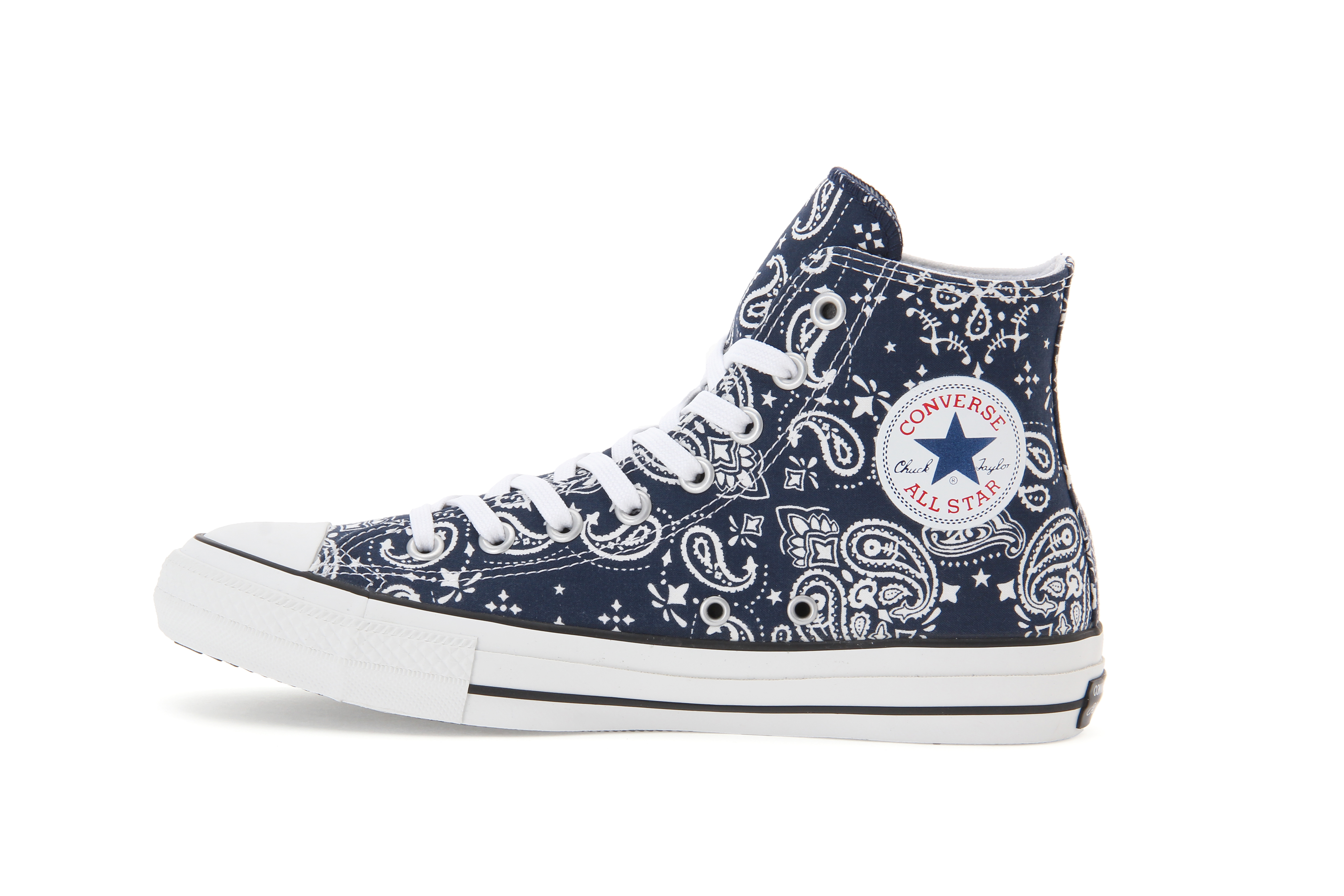 今回素材アレンジモデルとして新たに加わるのは、〈ALL STAR 100 BANDANA HI/OX〉。その名の通り、アメリカのファッションアイテムとして欠かせない「バンダナ」がモチーフ。さらには、ペイズリー柄のプリントを施したコットン素材を採用することで、 モチーフ独特の雰囲気を表現。インパクトある柄ながら、ネイビーとレッドのモノトーンプリントにすることで幅広いスタイリングに合わせやすい、足元のアクセントになるアイテムに仕上がっている。