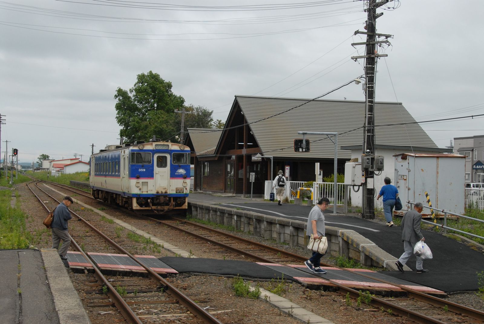 次の静内駅では27分停車。座り疲れたので、気分転換に列車から降りる。駅前の様子を見に行き、トイレも済ませ、売店を冷やかしてみたけれど、欲しいものはなかった。駅員がいたので入場券を買い求めた。上り列車が到着して、その車両との並びを撮っているうちに発車時間が来たので車内へ戻る。すると、高校生が大勢乗っていた。北海道の夏休みは短く、8月の後半にもなると授業が始まるようだ。