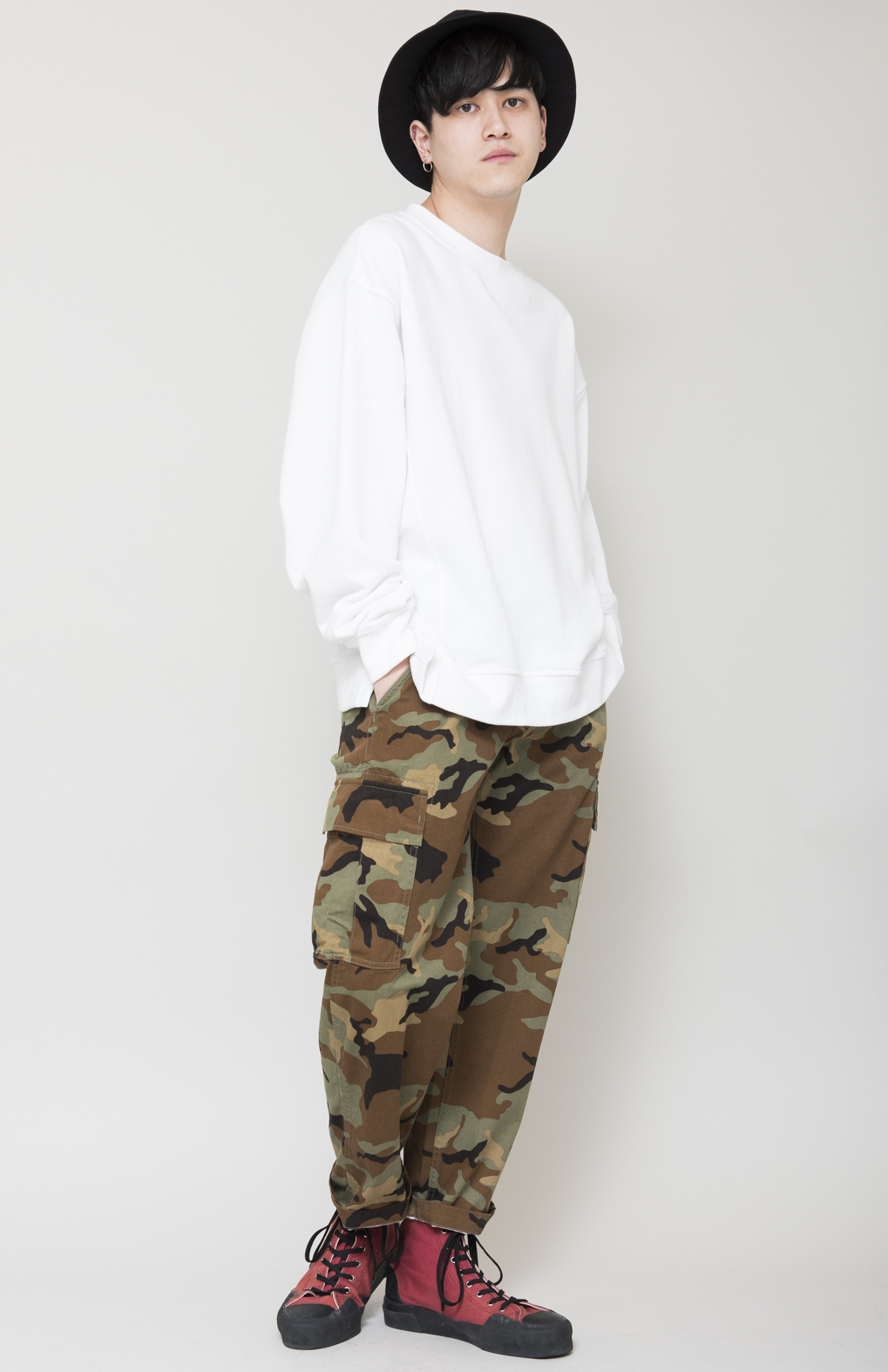 「お花見と言えば、やっぱりブルーシートを広げて楽しむもの。なので、汚れても目立たないカモフラ柄のカーゴパンツを選びました。トップスもざっくりとしたスウェットを選び、ゆるシルエットで動きやすさ、飲み食いのしやすさも意識しています。またシンプル過ぎないよう、赤スニーカーでインパクトを与えたのもポイントですね。渋めな赤なので、カーキとも相性◎!」