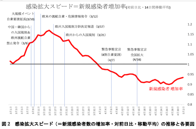 図1をご覧下さい。これは、「新規感染者数の増加率」、つまり、「感染者が増えていくスピード」の推移を示しています。