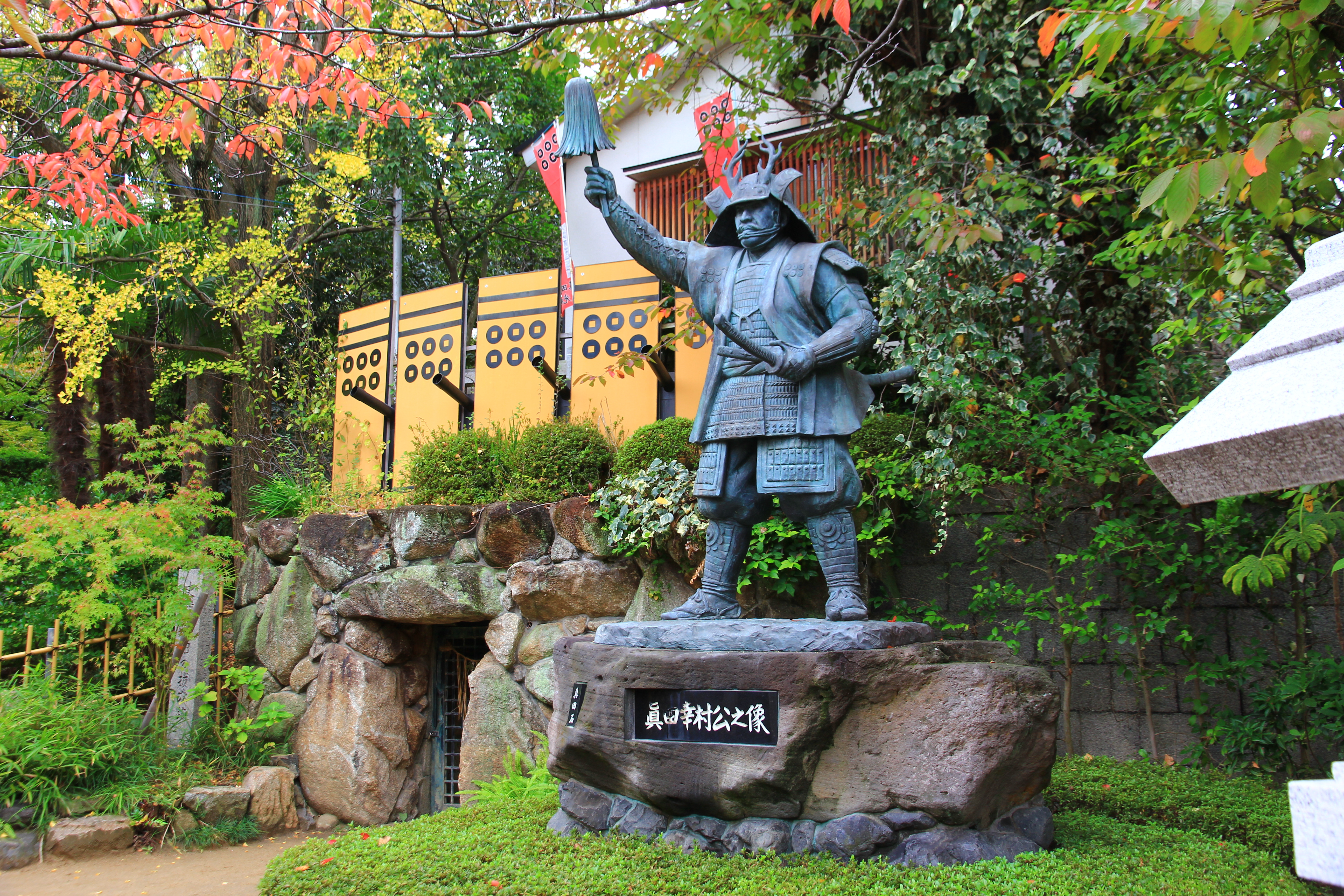 真田ファン憧れの聖地。境内南側の斜面には、大坂城まで続いていたという、かの「真田の抜け穴」が口を開け、甲冑姿で采配を振るう信繁の銅像が立つ。台座石は真田家菩提寺・信州上田の長谷寺から運ばれたもので、抜け穴の扉と演出用の置き盾には六文銭があしらわれ、まさに真田一色。秋の真田祭りでは抜け穴が開放されるが、すぐ先で陸軍墓地にぶつかるため、いまだ全容は謎。台地上の小高い丘の上にあり、いかにも砦っぽい立地にもときめくが、そもそもは1600年もの歴史ある神社なので、記念撮影はお参りのあとに。