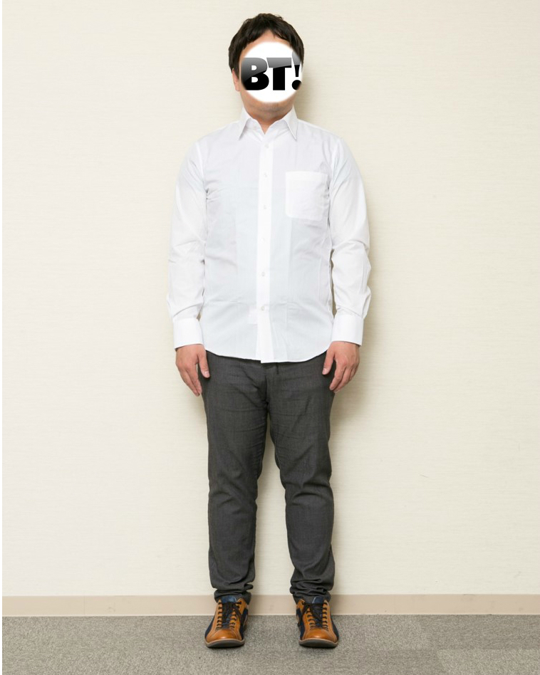 定番的なレギュラーカラーのシャツ(※写真1)を何も意識せずに着用しても不正解とまでは言いません。ただし、その場合の“着やせ効果”はほぼ皆無です。着こなしによっては堅苦しくて無粋に見えることもあります。さらに、太り気味なのに首元の余裕が感じられないと、コンパクトな首周りとの対比で顔が大きく見えてしまう可能性すらあります。
