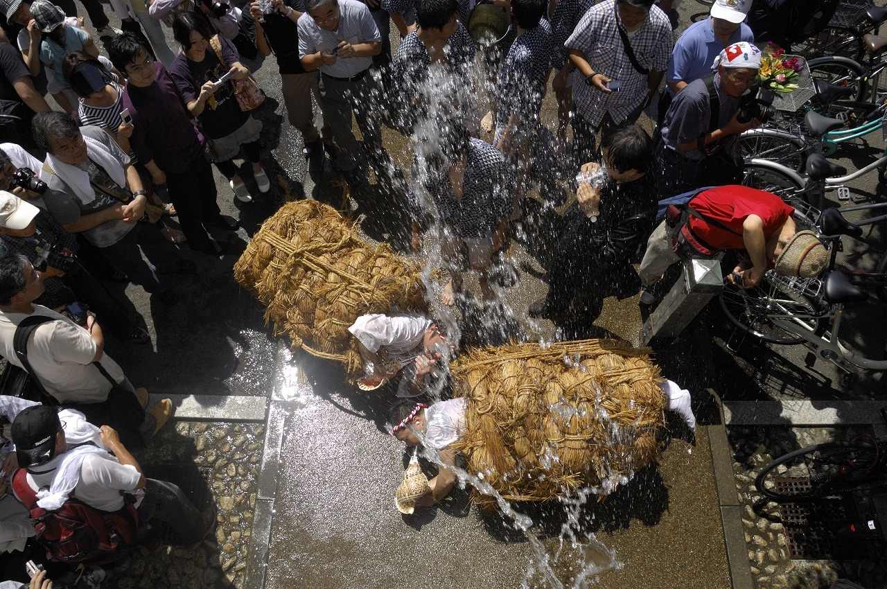 白装束の男たちが米俵のような荒縄にすっぽり入ると、祭りの始まり。水をかけられ、転がされ…それでも吹き続ける。