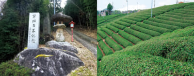 明治初期に京都府の主導により開拓された童仙房に広がる大規模な山なり茶園。府の文化的景観に選定されている。開拓100年を記念してたてられた開拓碑[左]。