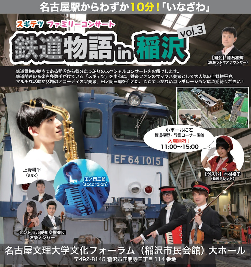 スギテツファミリーコンサート 鉄道物語in稲沢vol.3 日にち:2020年10月18日(日) 場所:名古屋文理大学文化フォーラム 料金:全席指定 2,000円(税込) 時間:15:00開演(45分前に開場)