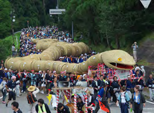 水害除けの祭りとして1988年に初開催。竹とワラで作られる大蛇は長さ82.8m、重さは2tにもなる。当日は500人以上の参加者がこれを担ぎ、村を3時