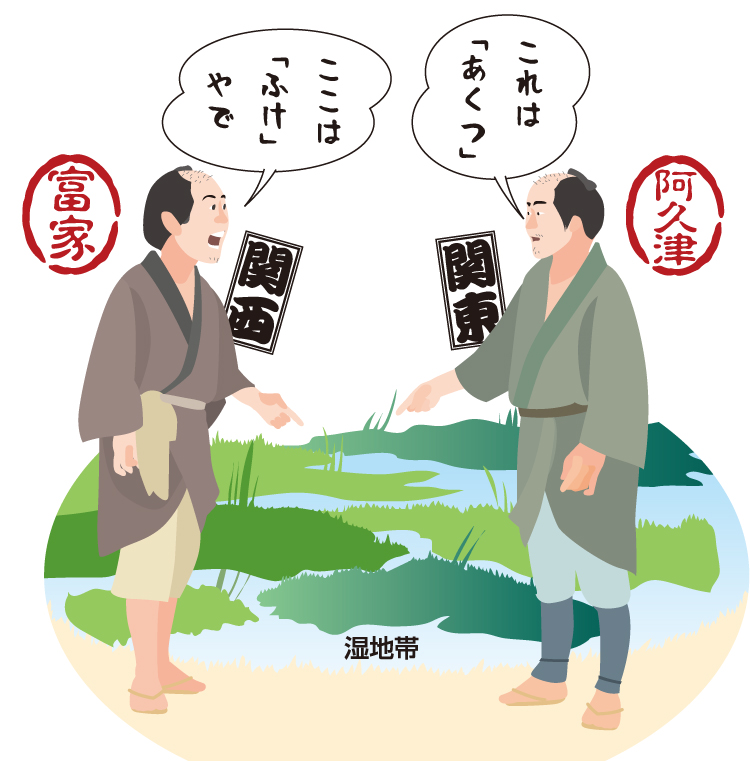 「福家」「富家」「浮気」「泓」など、漢字ではさまざまに書くが、すべて同じ湿地である。つまり「あくつ」さんも「ふけ」さんも、音で聞くと、まるで違う名字だが、ともに湿地に由来するという共通点があるのだ。
