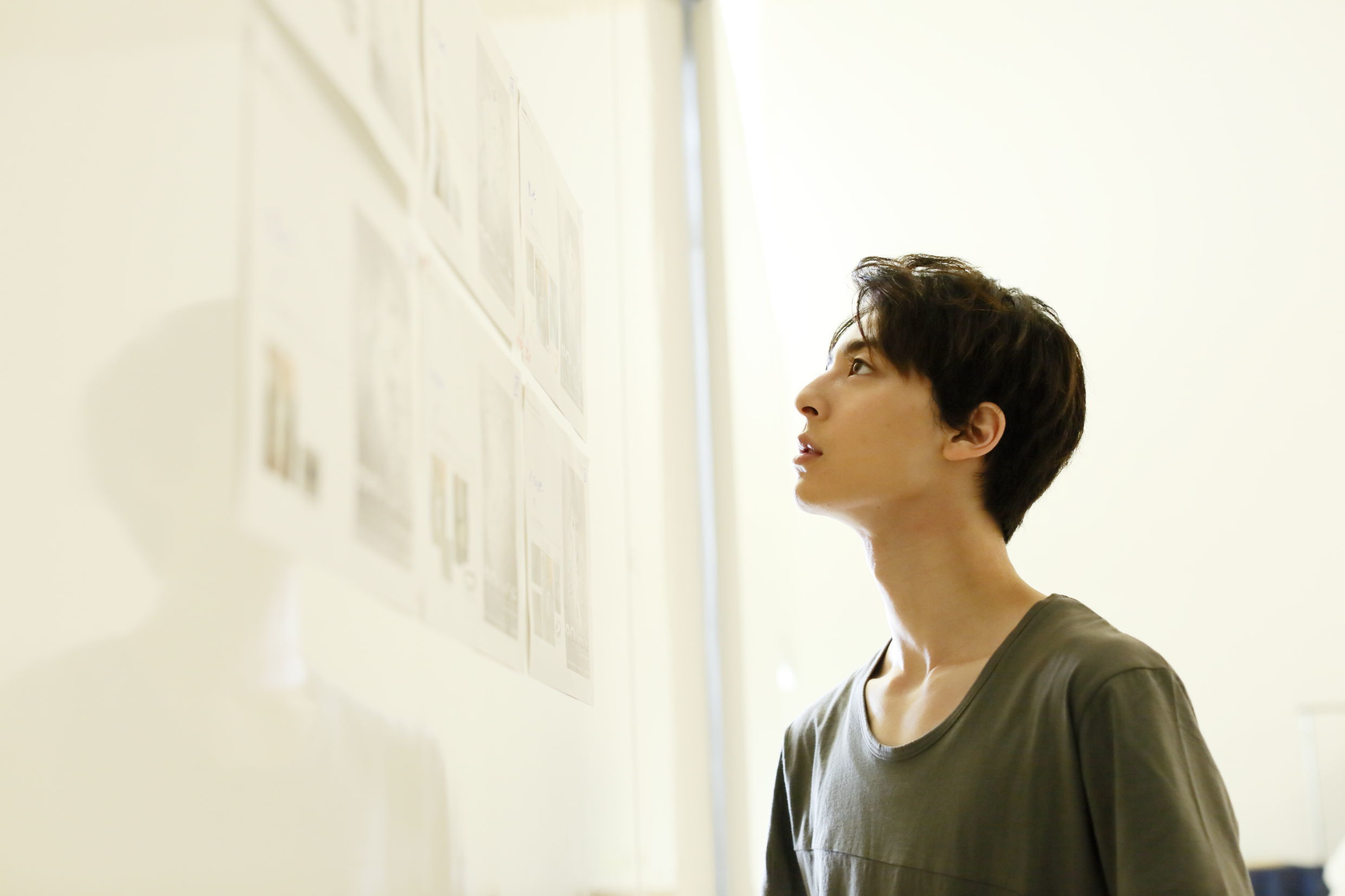 壁に貼られたラフコンテをじっくりと見つめて“ふむふむ”といった表情を見せたり、