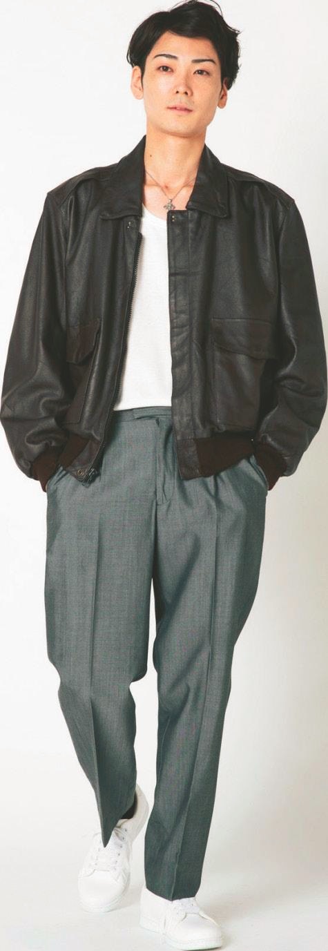 ウン十万円のレザーブルゾンを使用したスタイルも、ブルゾンを使って格安で構築。ここ“ならでは”のスタイルコンシャスなミニマムシルエットを、古着を使ってあえて難易度抑えめのシェイプに改変。