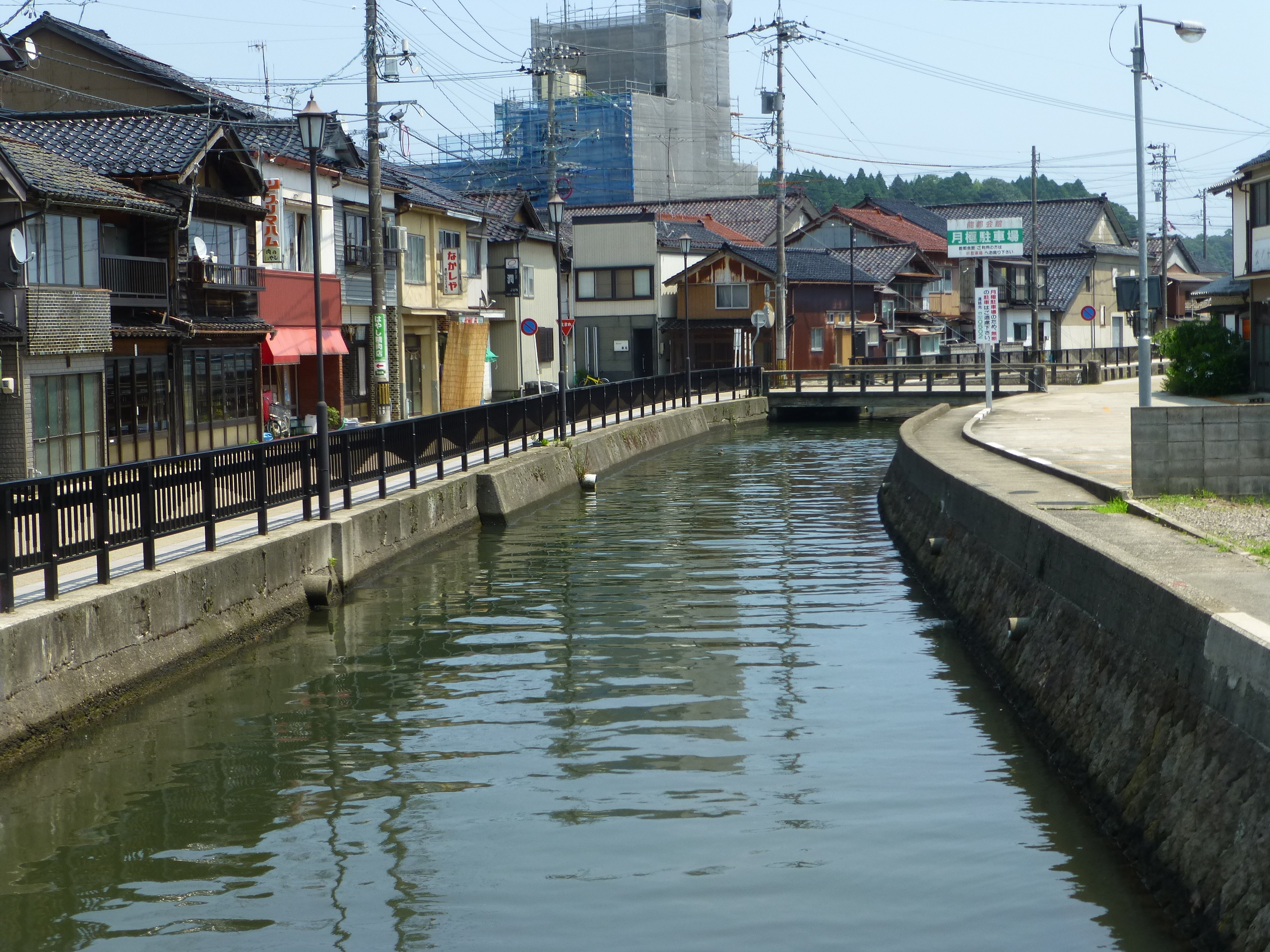 ほどなく藤波駅だがお昼時なのでスルーして宇出津(うしつ)の町へ入る。ここは現在の能登町役場もある一帯の中心地で、かつては七尾への沿岸航路や佐渡を結ぶ船便も発着する交通の要であり、漁港としても繁栄を誇った町である。現在では歴史ある街並みを保存する動きも出てきたようだ。ただし能登線が宇出津まで伸びたのは昭和35年(1960)と遅い。駅跡は能登中央図書館などの施設となっているが、今も「宇出津駅前」を名乗るバス停がロータリーに発着しており、ここからやはり廃駅の「輪島駅前」に向けて路線バスが走っている。