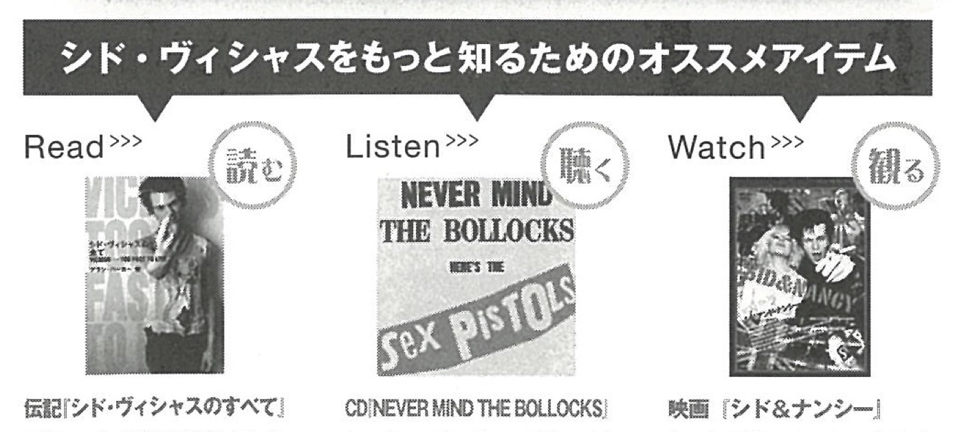 そんなシドのファッションで欠かせないアイテムが、ルイスレザーのライダースジャケットだ。重厚なイメージのダブルもタイトに着こなせることを、シドは証明してくれている。その他にシドがよく身に着けていたもので、ヒョウ柄のトップスとスタッズ付きリストバンドがある。前者は、ライダースに比べ認知度は低いが、意外にヒョウ柄もよく着ていた。素肌にヒョウ柄ベストといった着こなしも彼らしいコーディネイト。後者のスタッズ付きリストバンドはシドの代名詞。1970年代当時のパンクシーンでは、同じスタッズでもピラミッドタイプが主流で、彼自身も好んで着用していた。