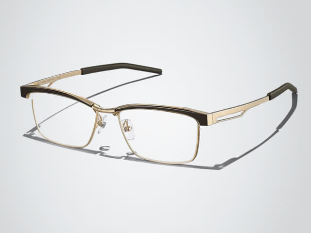 先述の[SP-20]と同じ理由から、もう一つスクエアを紹介したい。ただしこちらは直線的でエッジィな構成が印象的なスタイルのメタルブロウだ。カッティングを施した多面的で存在感のあるブリッジからメタルブロウ、テンプルにかけての立体感で存在感もある表情が上質感を生み、洗練された大人な表情を求めるシニアには、ぜひとも掛けて欲しいシェイプと言える……(軽くて快適だし)。