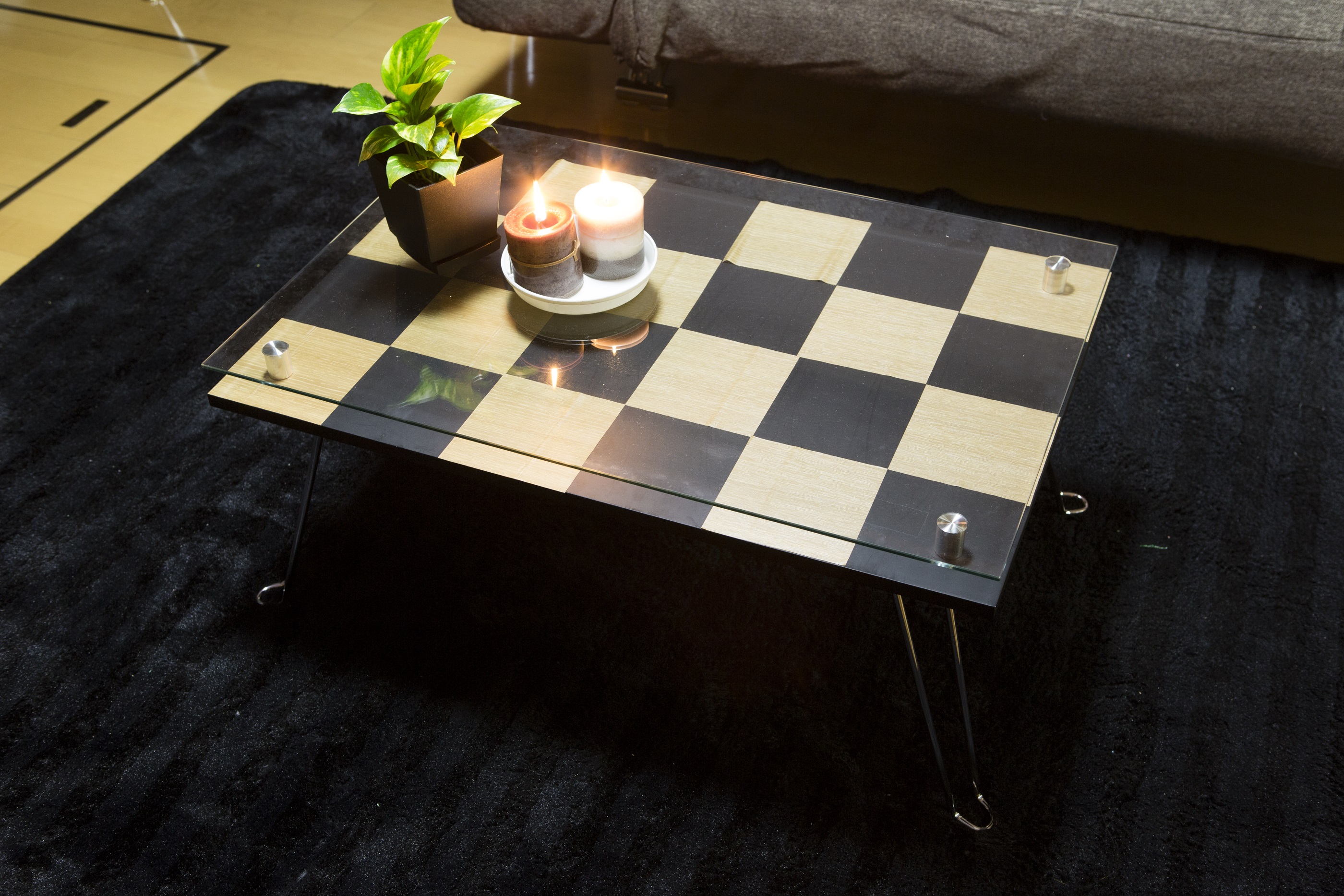 写真を拡大 3. テーブル上で市松模様になるようレイアウトして貼る。あとは外したガラスを元通りに戻せば完成。