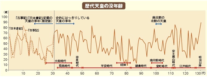 日本人の平均寿命は、近年になるにしたがってのびている。しかし、幼児死亡や、若い人の結核が減ったことに、その大きな原因があるとみられる。成人し、即位した天皇のお年は、時代によってそれほど大きくは違わないようである。