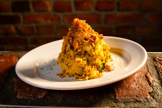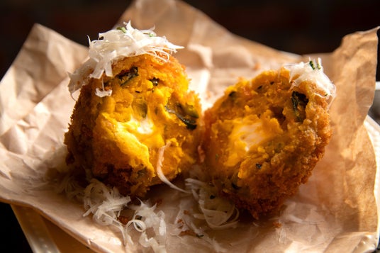 もう一品はコロンとした丸い姿がかわいいかぼちゃコロッケ(550円)。ふわふわのラクレットチーズが乗った熱々コロッケを割ると、中からはとろ~りチーズが。かぼちゃの甘味とチーズの塩味がバランスよく絡み、ほっこり優しい味わいのコロッケです。