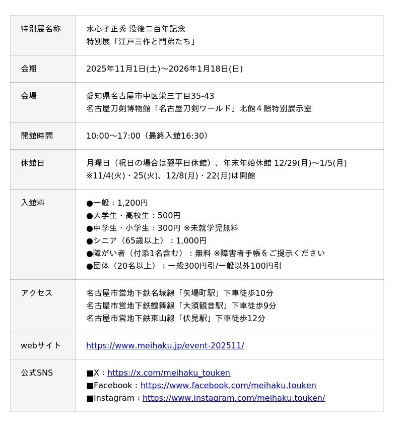 名古屋刀剣博物館「名古屋刀剣ワールド」(愛知県名古屋市、以下当館)では、2025年11月1日(土)~2026年1月18日(日)、特別展「江戸三作と門弟たち」を開催します。