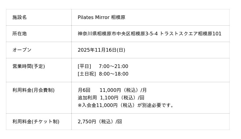 コナミスポーツ株式会社(以下、「弊社」)は、天井にミラーを設置したマシンピラティススタジオ「Pilates Mirror 相模原(神奈川県相模原市)」と「Pilates Mirror 千川(東京都豊島区)」を2025年11月16日(日)にオープンします。