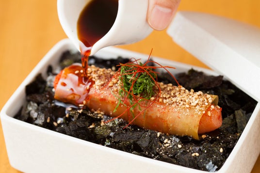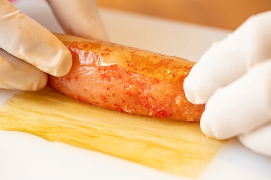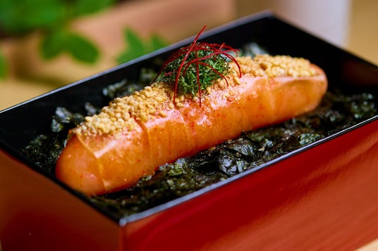めんたい重の「昆布巻き明太子」昆布や唐辛子など様々な旨味成分を配合した調味液に漬け込まれた明太子は、熟練した職人が日々確認・調整を行います。本来ならばそれで完成ですが、更に旨味成分を浸透させるため、特製調味だれに漬け込んだ昆布を明太子一つひとつに手作業で巻き付けます。