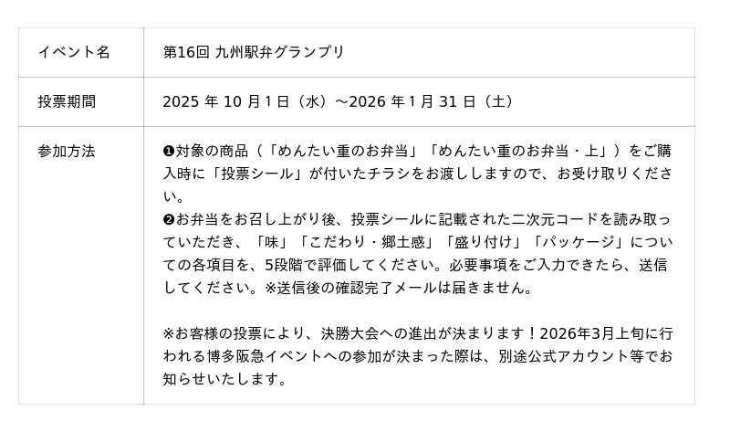 元祖博多めんたい重株式会社は、10月1日(水)より開催される「第16回九州駅弁グランプリ」に、満を持して初登場いたします。
