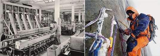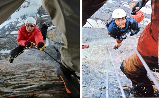 アイガー北壁:マムートアスリート小林由佳が再現した2025年(左)と、1969年に今井美智子がディレティッシマルートで登攀した際のオリジナル画像(右) - (写真クレジット左:マムートスポーツグループ、右:加藤武夫コレクション - All Rights Reserved)