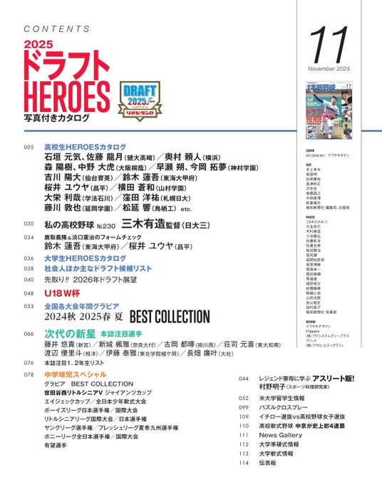 本誌名物連載「私の高校野球」には、今夏の甲子園準優勝の日大三・三木有造監督が登場。熱戦を勝ち抜いた舞台裏や、恩師・小倉全由前監督の思いを熱く語っています。沖縄で開催されたU18W杯に、2024秋~25夏のベストショットコレクションとして全国各地の大会で本誌が撮影した年間グラビアも収録。未来の高校球児となる中学野球特集も、ジャイアンツカップをはじめ夏の各大会の模様に全国の有望選手リストなど盛りだくさんの内容です。