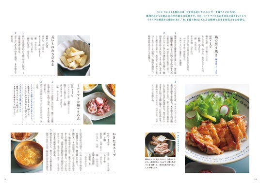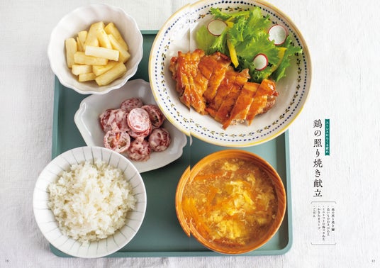 ストレスからくる疲れにぴったりの「鶏の照り焼き献立」や、便秘改善に役立つ「えのきとほうれん草の豚肉巻き献立」など計24献立紹介。健康やその日の体調に合わせて選べます。さらに同じ献立を繰り返していると味に慣れてしまい、飽きやすくなります。副菜や汁物を入れ替えられる「差し替えレシピ」も掲載。バリエーションメニューの中からお好みで組み合わせを変えれば、気分もリフレッシュでき、楽しく食事を続けられます。