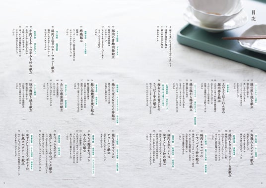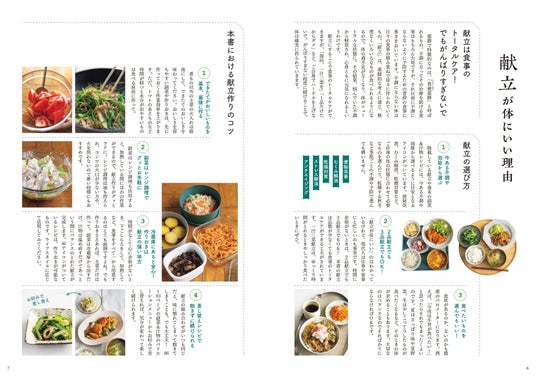 食べごたえのあるヘルシーな一汁三菜や、忙しい日でもさっと作れる栄養バランスのとれた2品献立、すぐに食べられる主菜と作りおきもできる副菜を組み合わせた献立など、毎日の献立を迷わず作れる料理レシピ99品を掲載。