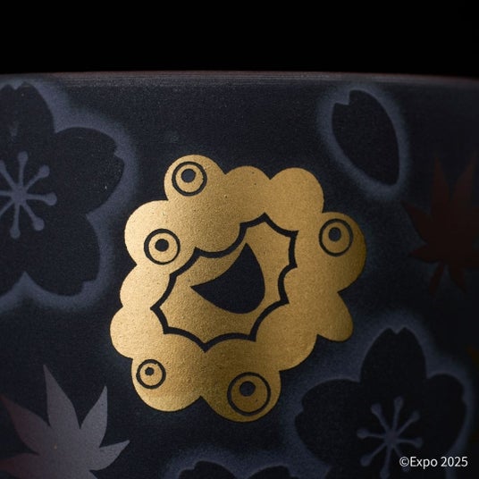本作の外観を彩るのは、煌びやかに輝く金彩。醉月氏は萬古焼の伝統的な製法に加え、ガラス加工などで用いるサンドブラスト技法を紫泥急須に取り入れ、新たな芸術の境地を開きました。 優美な桜・紅葉の模様の中には、大阪・関西万博公式キャラクター「ミャクミャク」の4パターンの愛らしい表情が生き生きと表現されています。匠が手掛ける日本の伝統美と、未来を象徴する現代アートの融合は、まさに大阪・関西万博の開催を記念するにふさわしい特別な逸品です。