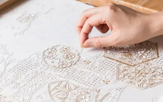 糸の太さや撚り、刺し方を巧みに使い分けることで、糸の光沢と豊かな立体感を引き出し、その柔らかな風合いは手刺繍以外では表現する事は出来ません。