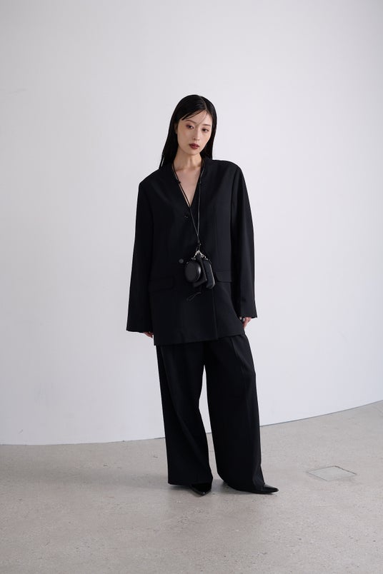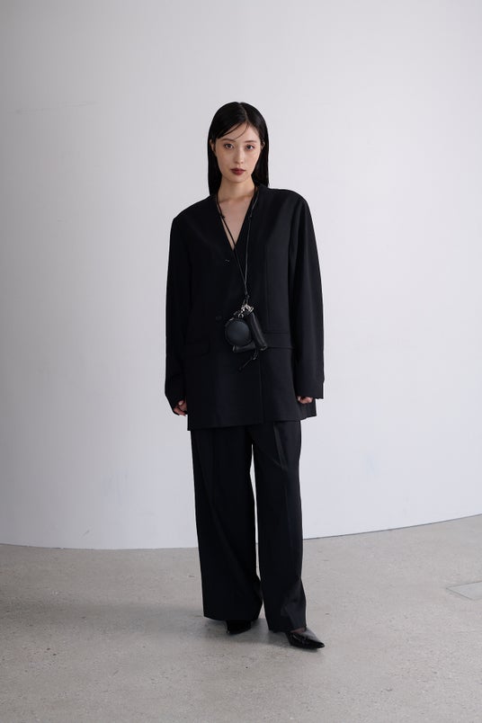 ノーカラージャケット ¥38,500(税込)・タックワイドパンツ ¥29,700(税込)