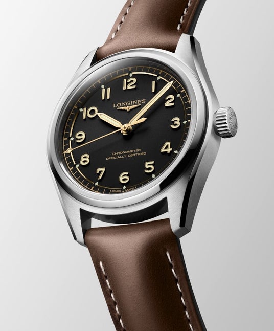 「ロンジン スピリット パイロット」は、「ロンジン スピリット」コレクションのルーツである航空技術を忠実に再現した流線型の3針モデルです。人間工学に基づき再設計された39mmのステンレススティール製ケースを備え、着け心地と見た目の美しさを向上させています。クリーンなマットブラックの文字盤で純粋な機能性を追求。オリジナルの「スピリット」3針モデルにあった5つ星と日付表示をとり、ミニッツトラックをより明瞭にしました。 ゴールドカラーの針とアプライドのアラビア数字が印象的なコントラストを生み出し、あらゆるコンディションでの視認性を実現するとともに、この時計にヴィンテージの魅力を与えています。
