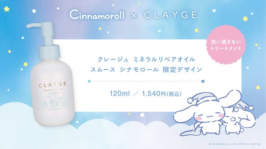 こだわりのクレイ成分を配合したプロダクトで、毎日の生活に癒しを届ける、ヘアケア・スキンケアブランドの『CLAYGE(クレージュ)』の人気定番商品の『シャンプー&トリートメント SR』、『ミネラルリペアオイル スムース』がシナモロールとコラボレーション。