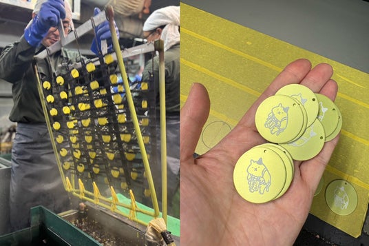 さらに“おまけ”のアルミチャームは、アルミや樹脂の加工を得意とする『三栄金属製作所』によりアルミをプレスで切り出して製作し、表面処理加工のアルマイトを得意とする『電研』により耐久性のあるアルマイト加工で鮮やかに色付け。そこに、生野区で愛されているイラストレーター「スタジオモンターグ」の松井さんによる『丁稚ネコ』のイラストをサコッシュ同様にUV印刷で表現しました。