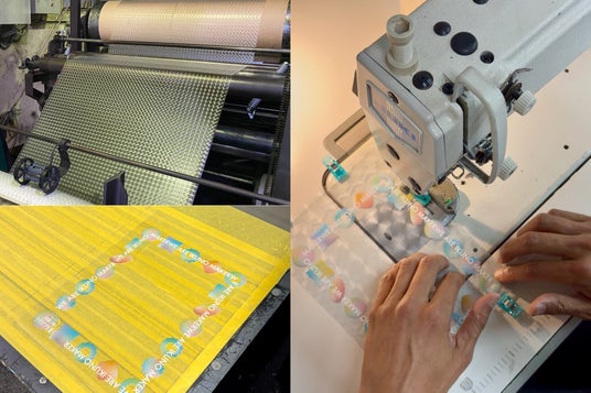 まず、サコッシュの生地を、塩化ビニル素材の加工を得意とする『カナビー』により、お菓子の包装紙がひっつきにくいビニールを提供いただき、そこにエンボス加工を施し、サコッシュに合ったサイズに切り出していただきました。